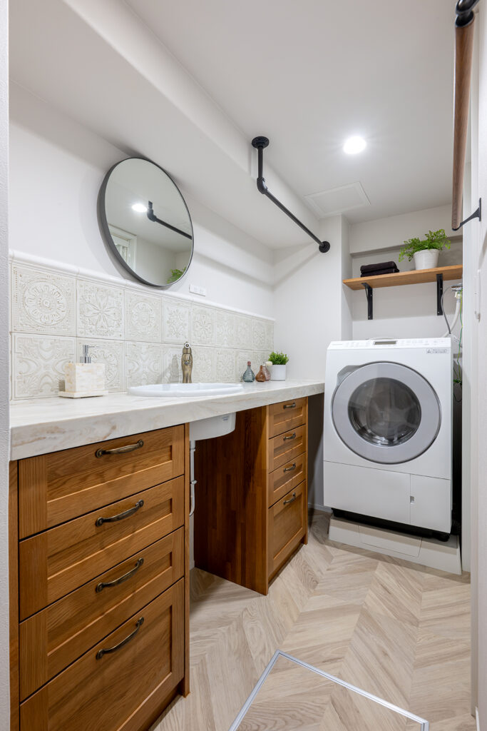 - 収納力のある洗面台、メイクスペース、身支度しやすい工夫、という観点から実用性の高い設計ポイントが分かる