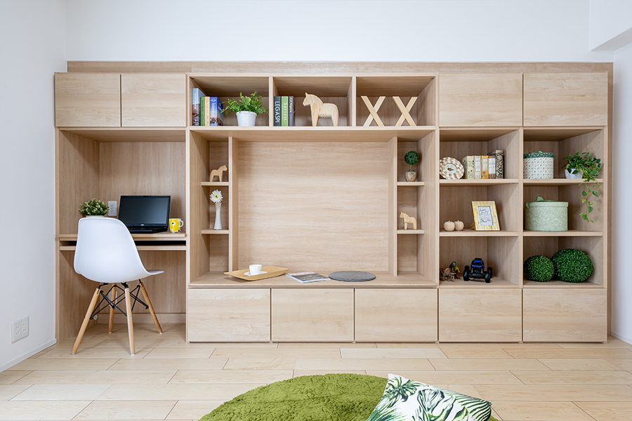Panasonicの造り付け収納シリーズ。テレビボードからリビング収納、ランドセル置き場まで幅広く対応できるシステム家具で、組み合わせ自由。奥行きや高さの選択肢も豊富で、空間にぴったりフィットさせられます。