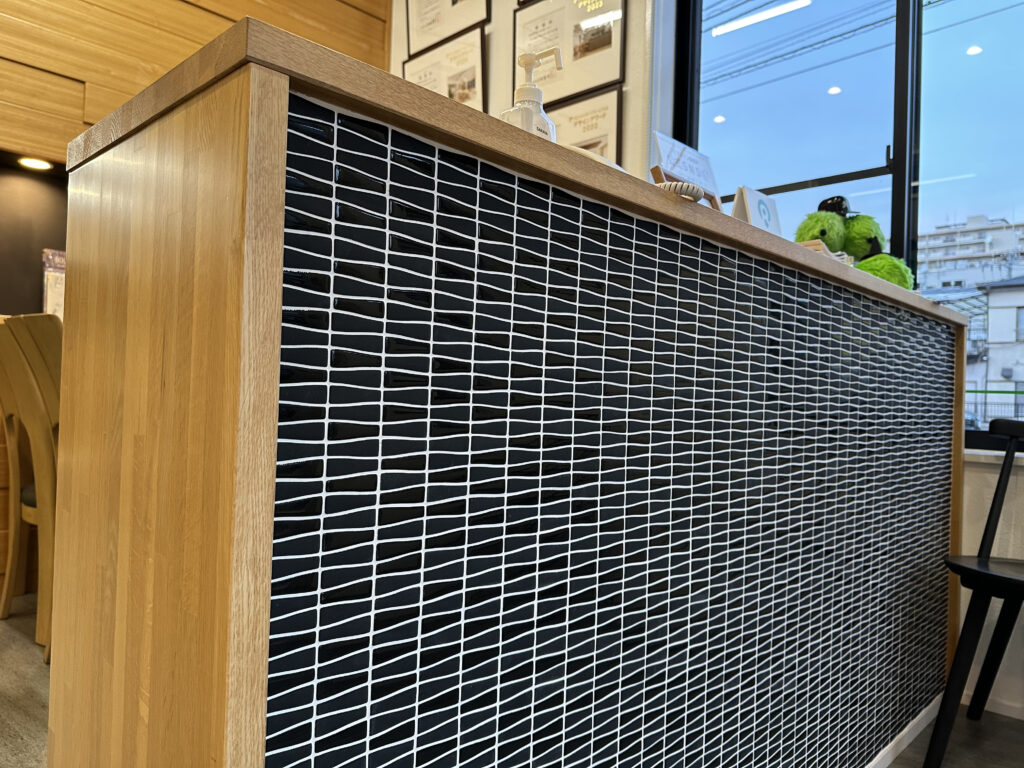 前面にはタイルを敷き詰め、ショールームらしい素材感を感じられるデザインになっています。